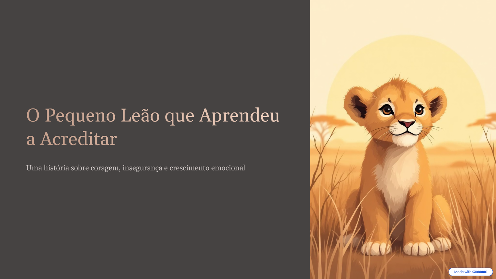 “O Pequeno Leão que Aprendeu a Acreditar”, focado em coragem, insegurança e crescimento emocional.